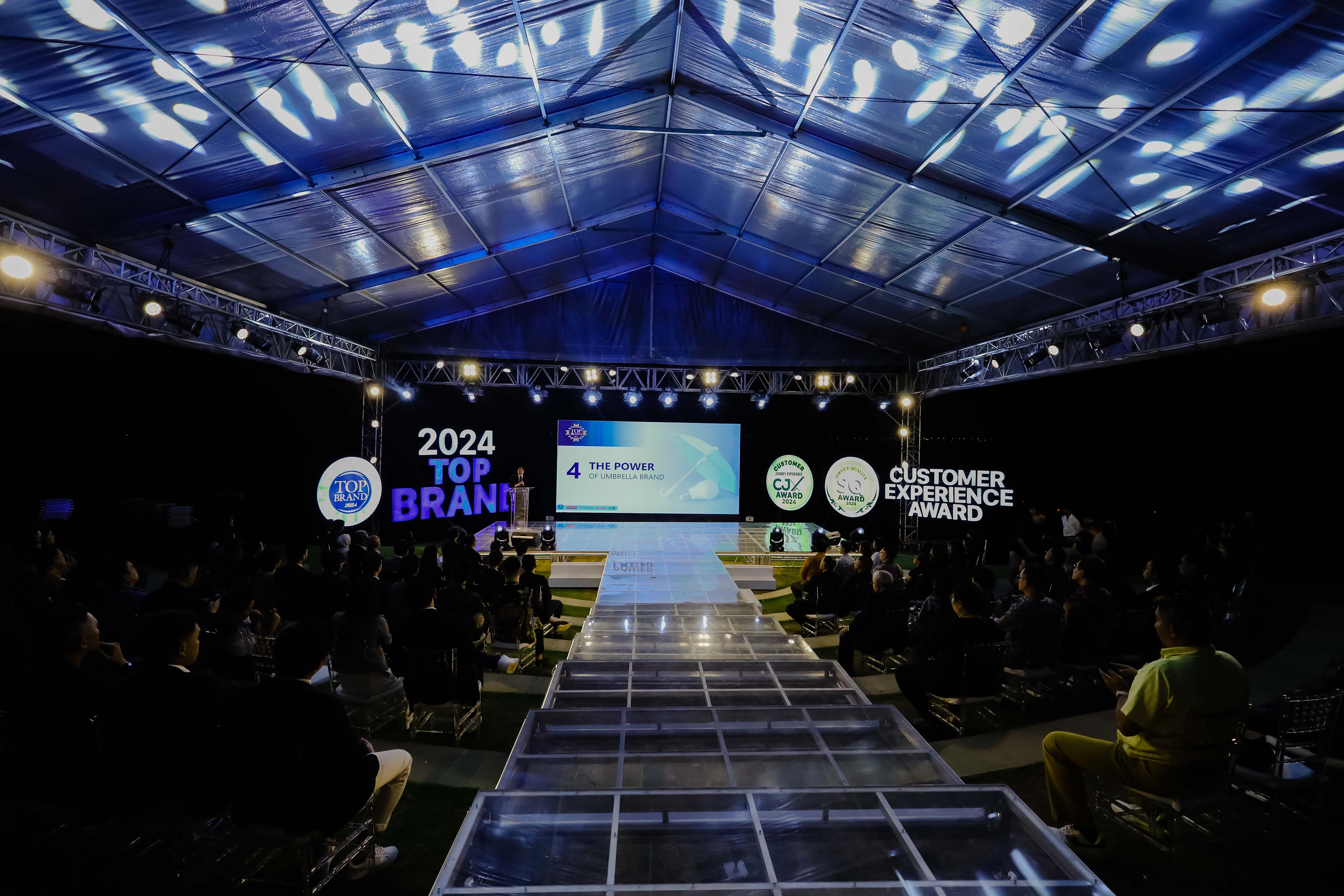 Setelah presentasi Yuliana Agung, tibalah pada acara puncak penyerahan sertifikat kepada brand-brand peraih TOP Brand 2024 di panggung yang megah. Diiringi musik yang diputar oleh DJ, acara diakhiri dengan foto-foto para pemenang di atas panggung.